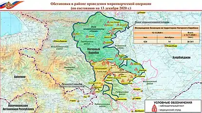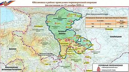 Rusya Kara Kuvvetleri'nin 15. Ayrı Motorlu Tüfek Tugayı[353] tarafından sağlanan ve Korgeneral Rüstem Muradov liderliğindeki 1,960 askerli Rus barış gücü,[354] Ermenistan ve Azerbaycan'ın ateşkes şartlarını uygulayıp uygulamadıklarını izlemek için antlaşma kapsamında bölgeye sevk edildi.[355] Hankendi yakınlarına yerleşen barış gücü, Dağlık Karabağ'daki temas hattı boyunca ve Laçın Koridoru boyunca gözlem noktaları kurdu.[356] Reuters, barış gücüne zırhlı personel taşıyıcıları, tanklar ve çok sayıda roketatarın eşlik ettiğini bildirdi.[357] 17 Kasım'da Rus barış güçleri, her iki tarafın ölü askerlerinin cesetlerini bulunması ve değişimi konusunda Uluslararası Kızıl Haç Komitesi'ne yardım etmeye[358] ve 23 Kasım'da da bölgedeki mayınları temizleme operasyonlarına başladı.[359]