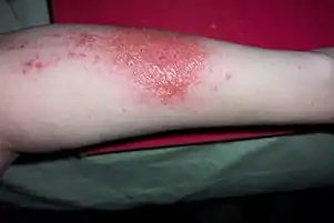 Nikel (yüzük, küpe, vb), makyaj malzemeleri, antibiyotikli pomatlar, petrol ürünleri kontakt dermatitlere neden olan maddelerin başında gelir. Eritemli lezyonlar genellikle ödemle birliktedir ve akut alerjilerin sonrasında ortaya çıkar.[1]