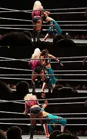 Alexa leaps off the corner and hits a beautiful sunset flip powerbomb