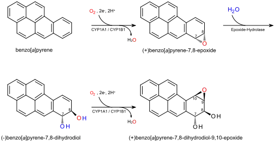 - Benzo[a]piren Sitokrom P450 1A1 tarafından okside edilip çeşitli ürünlere dönüşebilir, bunlardan biri (+)benzo[a]piren 7,8 epoksit'tir.[13]
