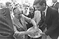 İsrail cumhurbaşkanı Haim Herzog Samaritan Topluluğu Tarafından ekmek ve tuzla karşılanıyor, 1984.