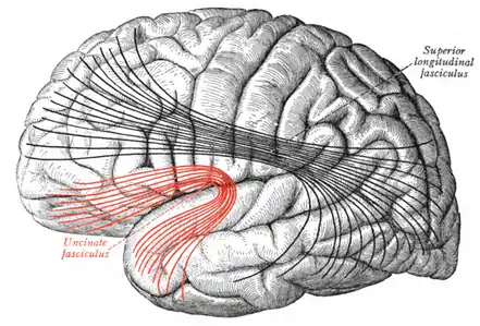 Fasciculus uncinatus, temporal lobun anteriyor kısımlarını, inferiyor frontal girus ve frontal lobun inferiyor yüzeylerine bağlayan kanca şeklinde bir akson demetidir. Anteriyor temporal lob ve amigdalada yukarı doğru çıkar, temporal lobda, eksternal kapsülün arkasında, insular korteksin iç tarafında yukarı doğru kıvrılır ve gyrus orbitalisin arka kısmına kadar devam eder.[1] . Hipokampusta kayda değer şekilde hücre gövdesi bulunduğu gözükmemektedir.
