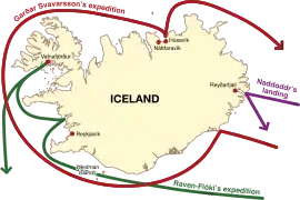 868 yılında, Garðar Svavarsson'un bulduğu toprakları aramak için kuzeye doğru yola çıkmıştır. Norveç'in batısından Shetland Adaları'na doğru denize açılmış, devamında Faroe Adaları'nda karaya çıkmıştır. Oradayken, İzlanda'yı arayışında faydalanmak için yanına üç kuzgun aldığından Hrafna-Flóki (Kuzgun Flóki) olarak tanınmıştır. Yelken açtıktan sonra kuzgunları uçurmuş; ilk kuzgun Faroe'ye geri dönmüş, ikincisi havada dolanıp gemiye geri dönmüş, üçüncüsü ise kuzeybatı yönüne doğru uçmuş ve geri dönmemiştir. Flóki de kuzeybatı yönüne doğru ilerlemiş ve İzlanda'nın batı kıyılarını keşfetmiştir. Westfjords bölgesinde karaya çıkmış ve kışı Vatnsfjörður'da geçirmiştir.[1] Buzdağlarıyla kaplı bir fiyordu gördükten sonra, bulduğu toprakları Ísland olarak adlandırmıştır.[2]