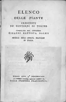 - "Elenchus recentium stirpium quas pedemontanae florae addendas censet J. B. Balbis m. d. exhibitus die 26 maj 1816 Aug. Taur.". 1816.