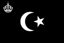 Kırmızı arka plan üzerine beyaz hilal ve beş köşeli yıldız. |