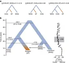 - Jones et al. 2015: "Caucasus hunter-gatherers (CHG) belong to a distinct ancient clade that split from western hunter-gatherers ~45 kya, shortly after the expansion of anatomically modern humans into Europe and from the ancestors of Neolithic farmers ~25 kya, around the Last Glacial Maximum."