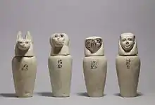 - Kebehsenuef : Horus'un bir oğludur, bağırsakları korur, şahin başlıdır.