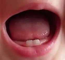 7 aylık bir bebeğin süt mandibular orta kesici dişleri. Dişlere tırtıklı bir görünüm veren kesici kenara dikkat ediniz. | |