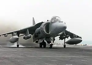 ![]() Bir AV-8B+ Harrier II Plus USS Nassau uçak gemisinde iken. | |