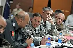 Afgan Güvenlik Bakanı General Munir Mangal (solda) Amerikan Gen. David Petraeus (ortada), Temmuz 2010