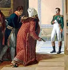 Amédée Jaubert Finkenstein Kalesi'nde Napolyon ile görüşmek için gelen Fars elçisi Mirza Muhammed Rıza Kazvini'ye eşlik ederken, 1807. Tablo François Mulard eseridir.