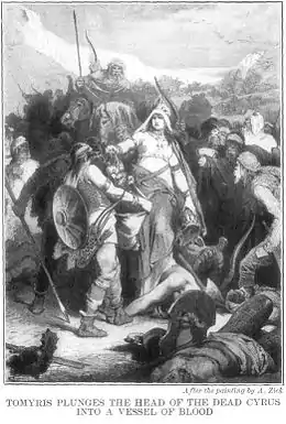 Peter Paul Rubensin çizdiği "Tomris Efsanesi" eserinde Tomris'in Fars hükümdarı Kiros'un başını kan dolu kaba düşürmesi.
