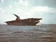 19 Mart 1945'te Kyūshū açığındaki hava savaşında Japon İmparatorluğu Deniz Kuvvetleri'ne ait bombardıman uçaklarının saldırısıyla ağır hasar görerek batacakken ABD'ye dönebilmiştir. Bu hikâye Gary Cooper'ın başrolünü oynadığı Task Force adlı filmde anlatıldığı için popüler olmuştur.