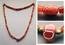 Ur Kraliyet Mezarları'nda bulunan bu kolyedeki kazınmış akik boncukların İndus Vadisi uygarlığından geldiği düşünülmektedir.